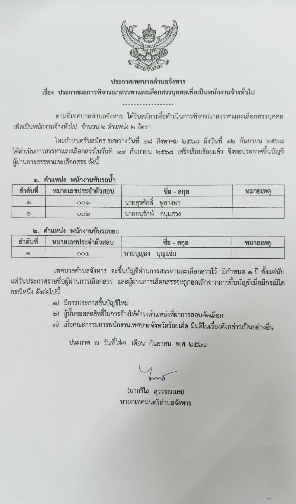 หัวข้อ :: ประกาศผลการพิจารณาสรรหาและเลือกสรรบุคคลเพื่อเป็นพนักงานจ้างทั่วไป